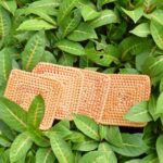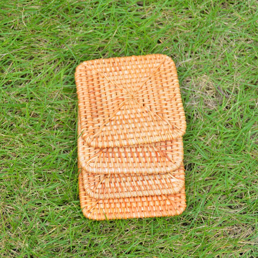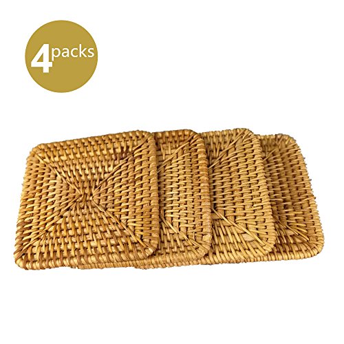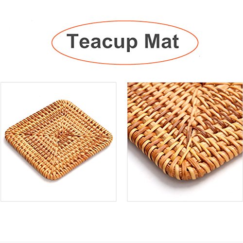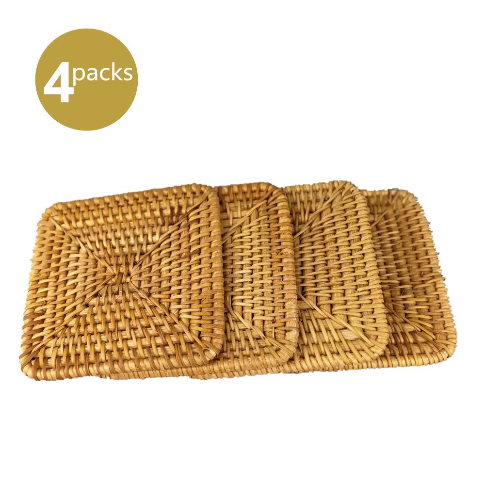 Dimensions: 3.9 x 3.9 inches, 0.2 inches thick. Material: Rattan. Care: Hand Wash Only. Not dishwasher safe.